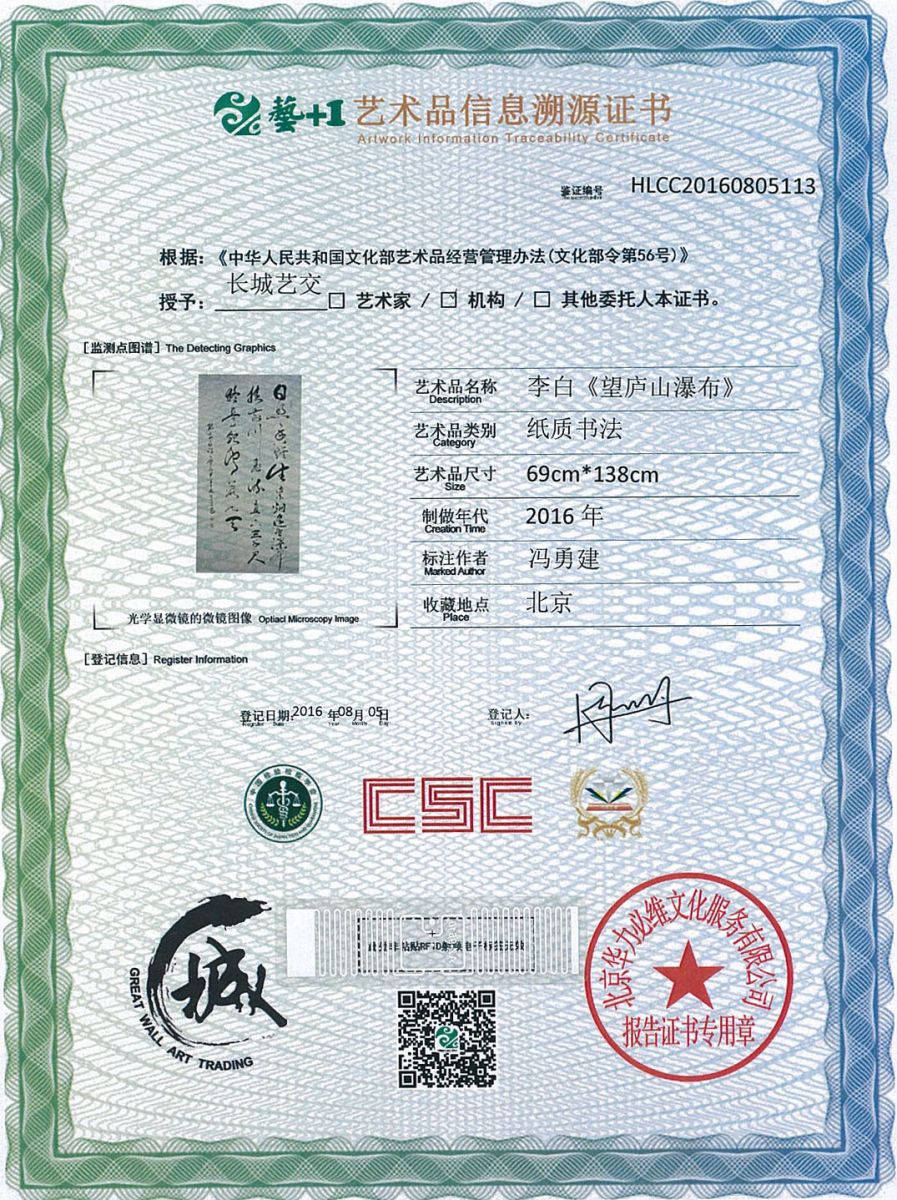 艺术品鉴证质量溯源鉴证证书