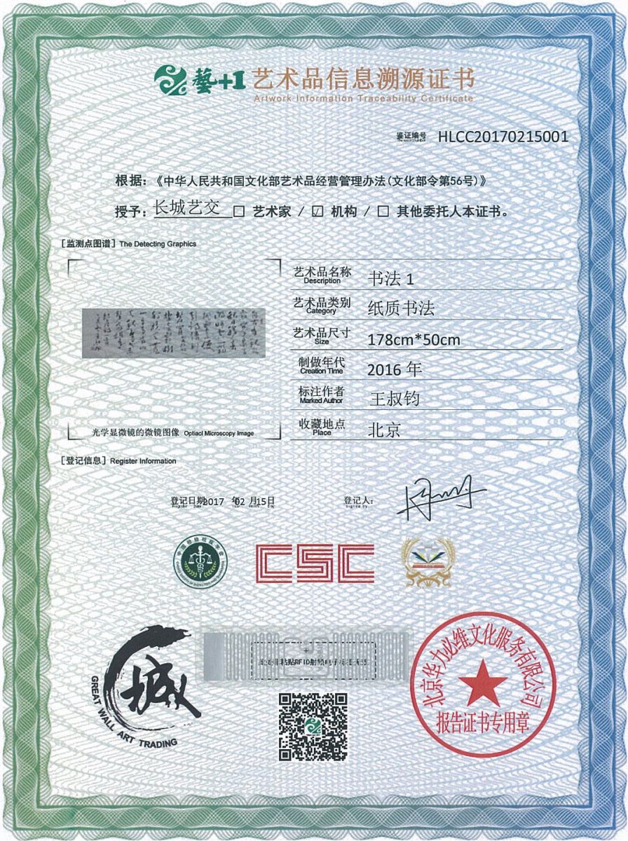 艺术品鉴证质量溯源鉴证证书