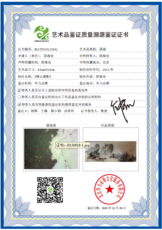 艺术品鉴证质量溯源鉴证证书