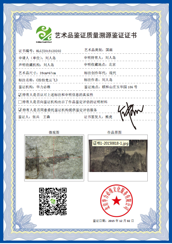 艺术品鉴证质量溯源鉴证证书