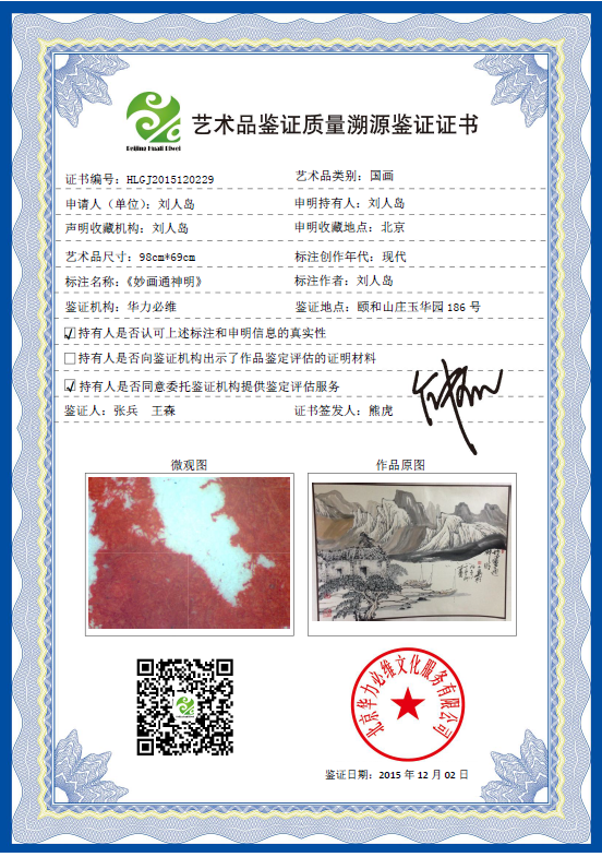 艺术品鉴证质量溯源鉴证证书