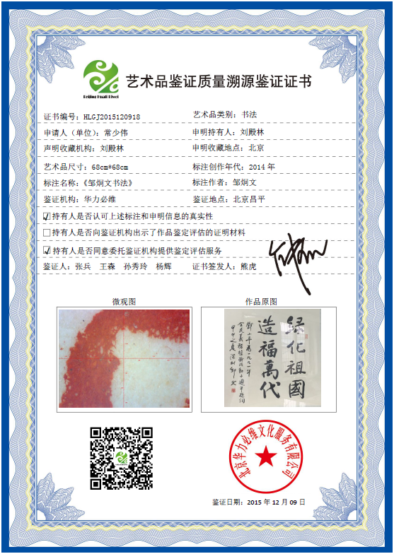 艺术品鉴证质量溯源鉴证证书