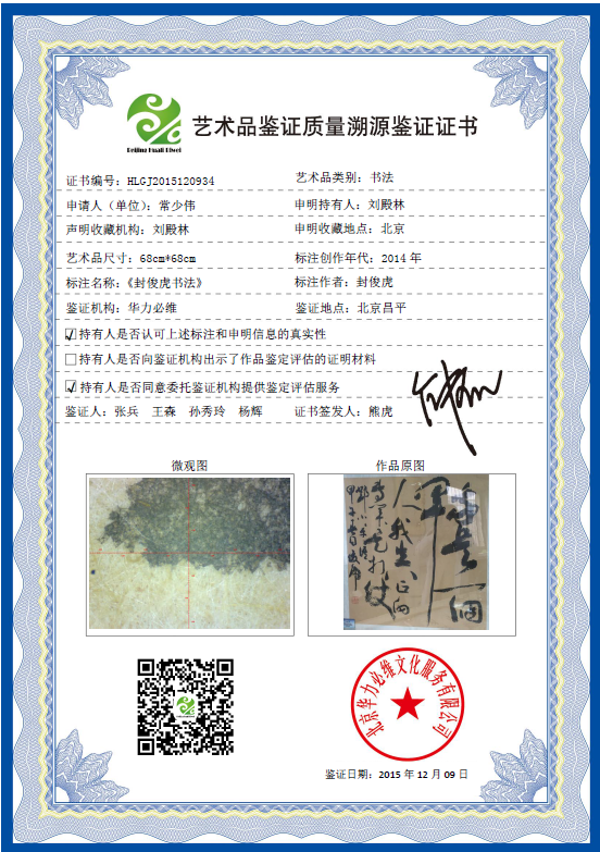 艺术品鉴证质量溯源鉴证证书