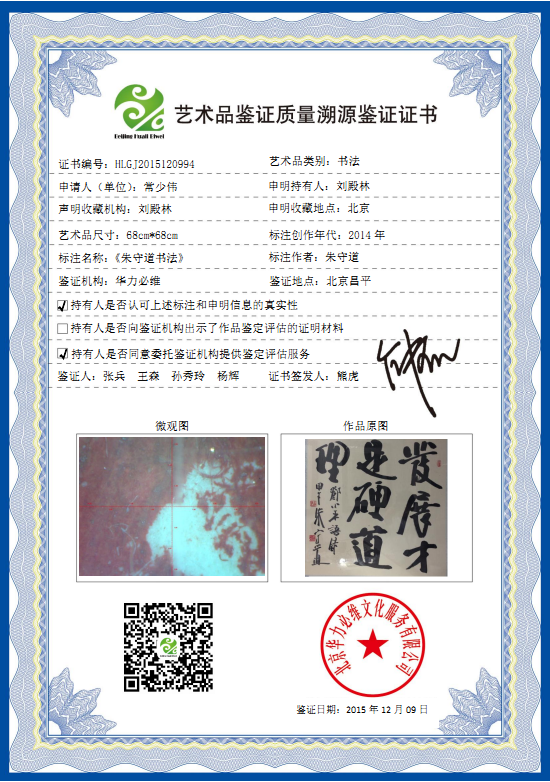 艺术品鉴证质量溯源鉴证证书