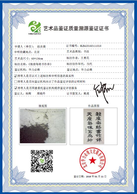 艺+1 艺术品鉴证质量溯源鉴证证书