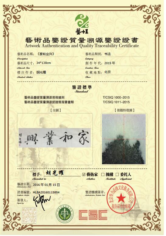 艺+1 艺术品鉴证质量溯源鉴证证书