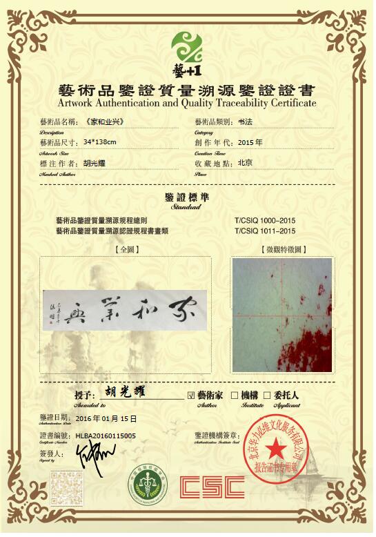 艺+1 艺术品鉴证质量溯源鉴证证书