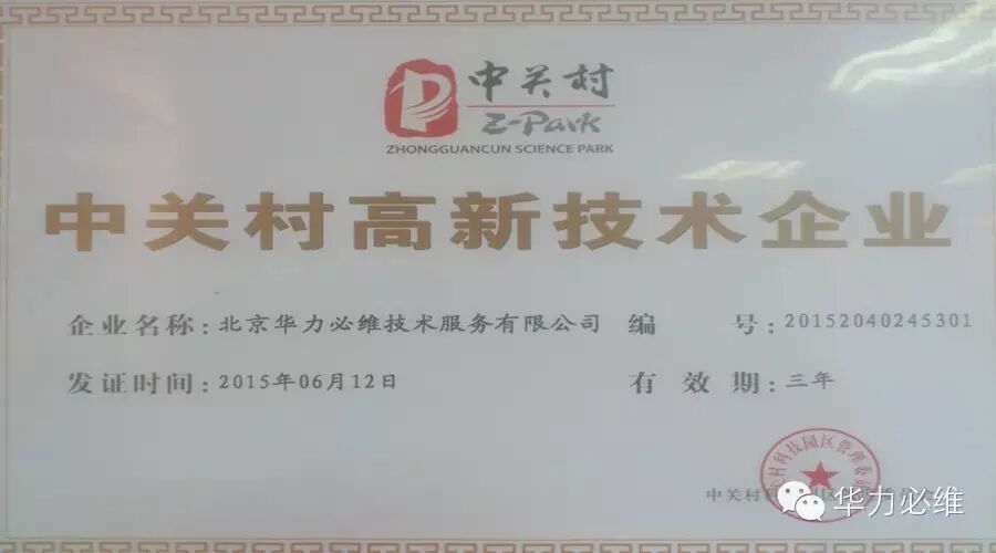 2015年6月,经过严格审核及评选,华力必维获颁中关村高新技术企业认可证书,被确定为中关村高新技术企业。中关村国家自主创新示范区,是中国最具影响力的科技创新中心,华力必维是中关村园区的重点企业,在中关园、望京园和清华园驻场办公,此次荣获中关村高新技术企业认可证书,是对华力必维创新研发实力的重要认可。