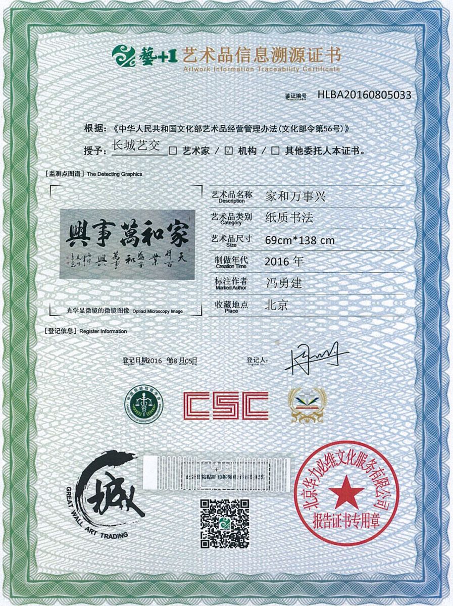 艺术品鉴证质量溯源鉴证证书