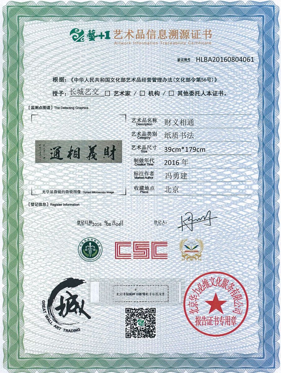 艺术品鉴证质量溯源鉴证证书