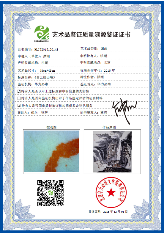 艺术品鉴证质量溯源鉴证证书