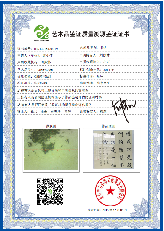 证书名称 艺术品鉴证质量溯源鉴证证书