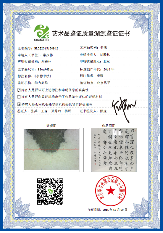 艺术品鉴证质量溯源鉴证证书