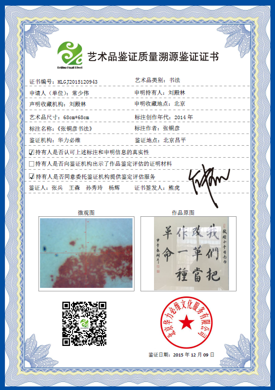 艺术品鉴证质量溯源鉴证证书