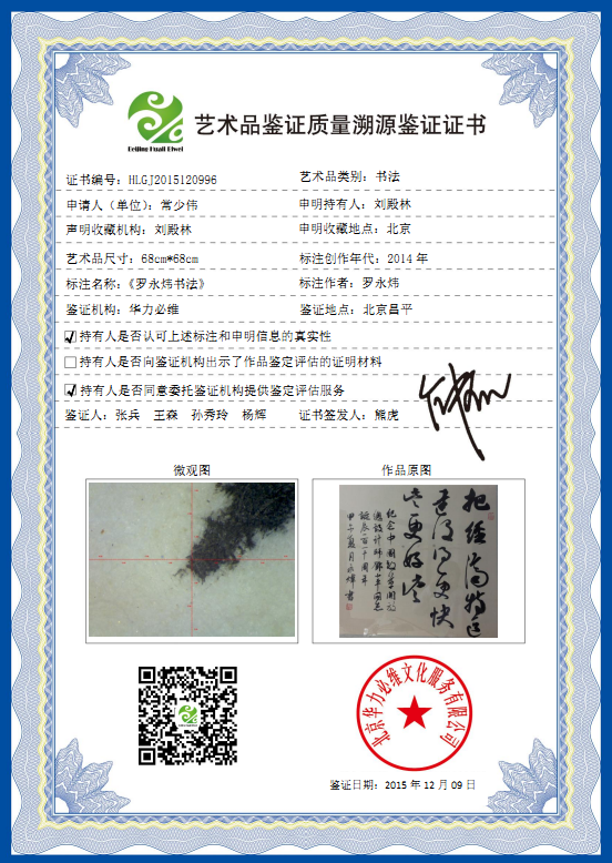 艺术品鉴证质量溯源鉴证证书