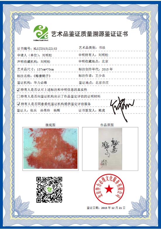 艺+1 艺术品鉴证质量溯源鉴证证书