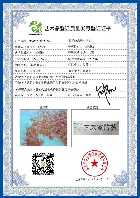 艺+1 艺术品鉴证质量溯源鉴证证书