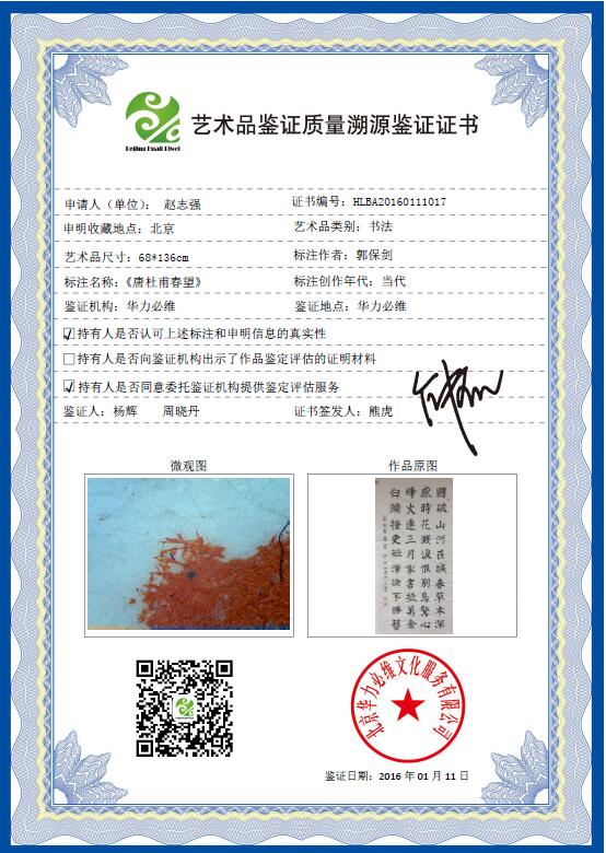 艺+1 艺术品鉴证质量溯源鉴证证书