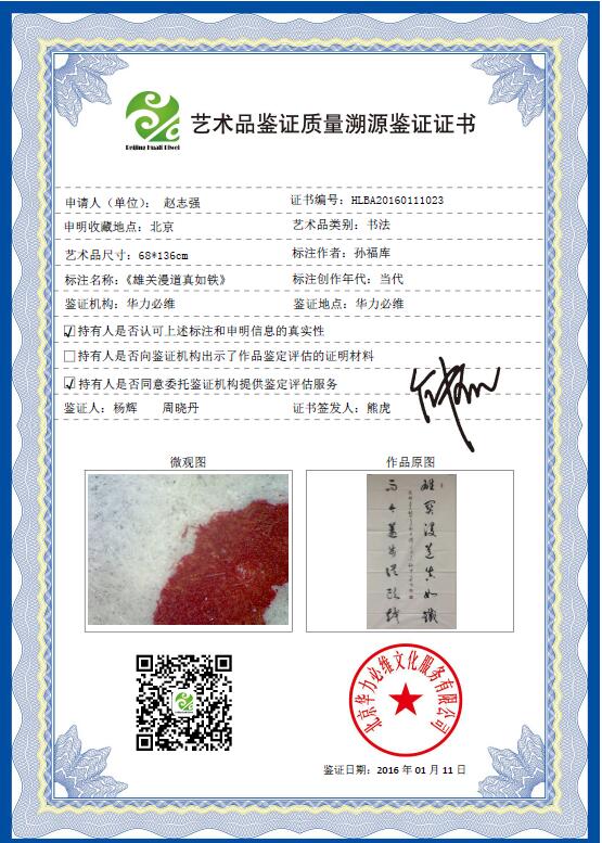 艺+1 艺术品鉴证质量溯源鉴证证书