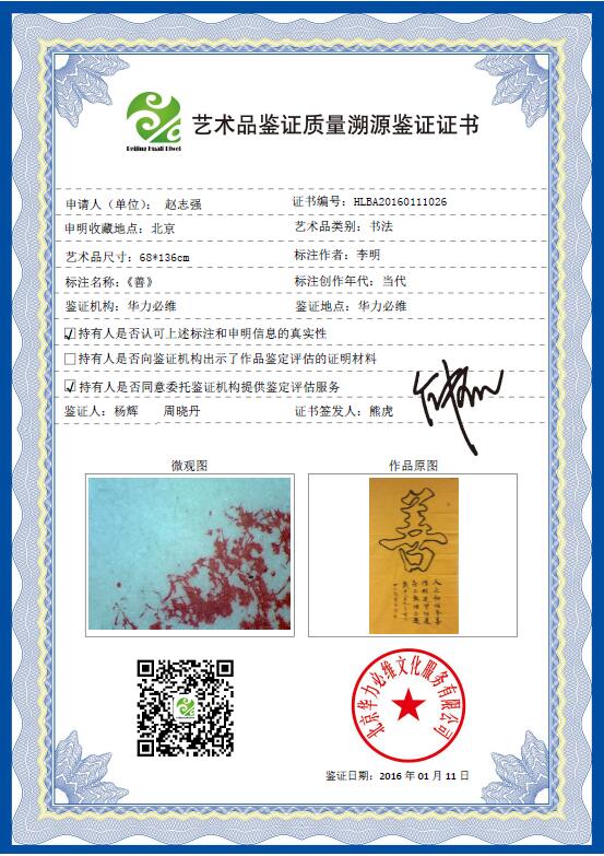 艺+1 艺术品鉴证质量溯源鉴证证书