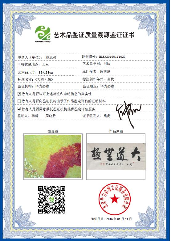 艺+1 艺术品鉴证质量溯源鉴证证书