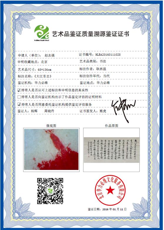 艺+1 艺术品鉴证质量溯源鉴证证书