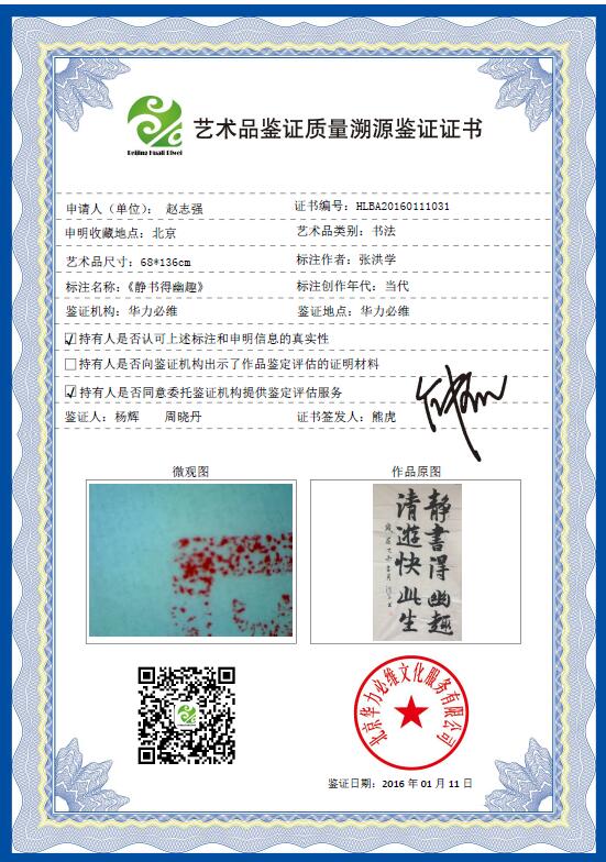 艺+1 艺术品鉴证质量溯源鉴证证书