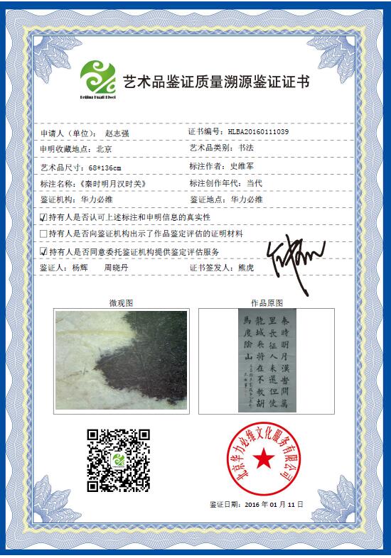 艺+1 艺术品鉴证质量溯源鉴证证书