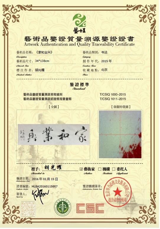 艺+1 艺术品鉴证质量溯源鉴证证书
