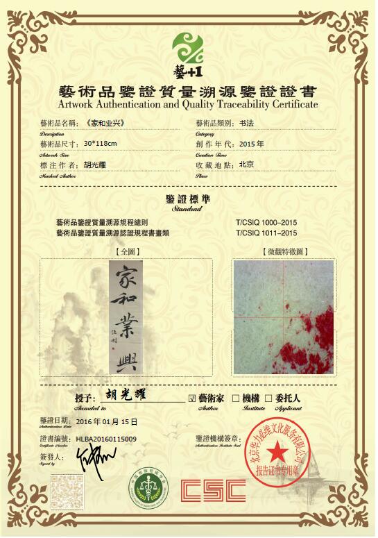 艺+1 艺术品鉴证质量溯源鉴证证书