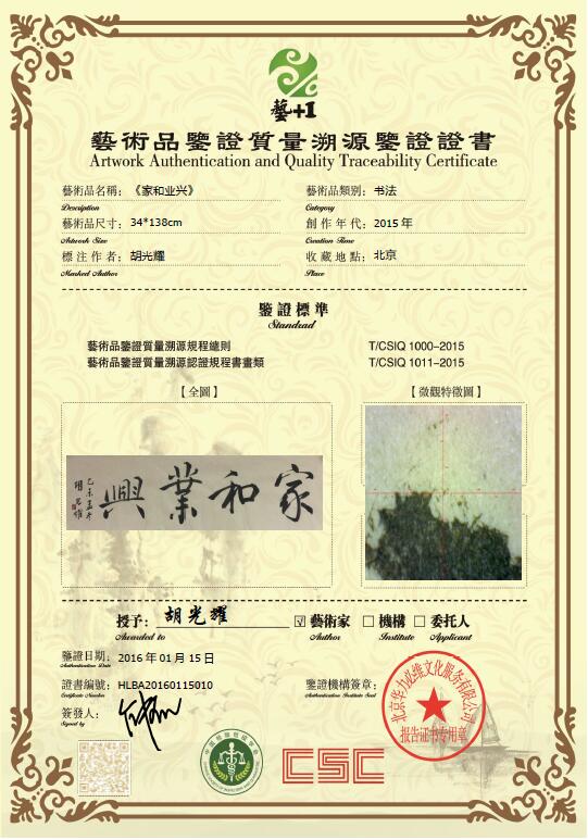 艺+1 艺术品鉴证质量溯源鉴证证书